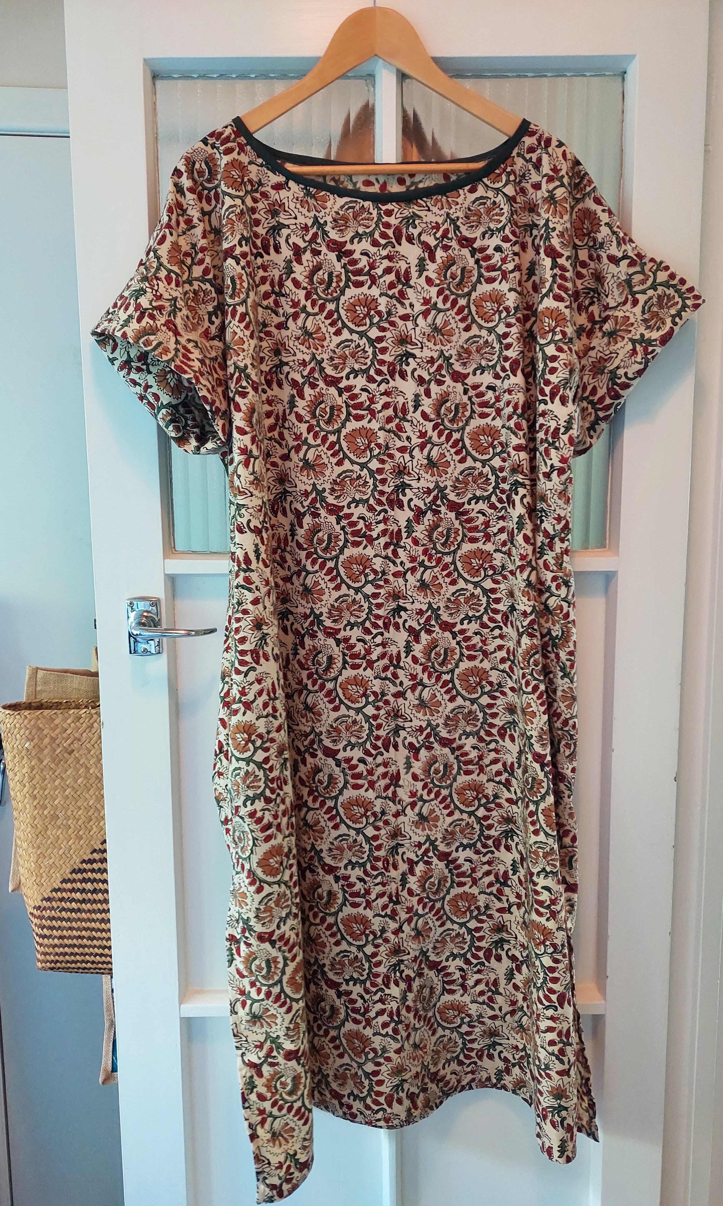 My first version is in a gorgeous Indian Block Cotton from Merchant & Mills , I brought this on hols in the UK last year intending to make PJ’s, but it seemed too pretty to hide away. Perfect and light for a summer dress. I didn’t have enough fabric to make binding so used a contrast linen scrap from my stash which I think works perfectly .