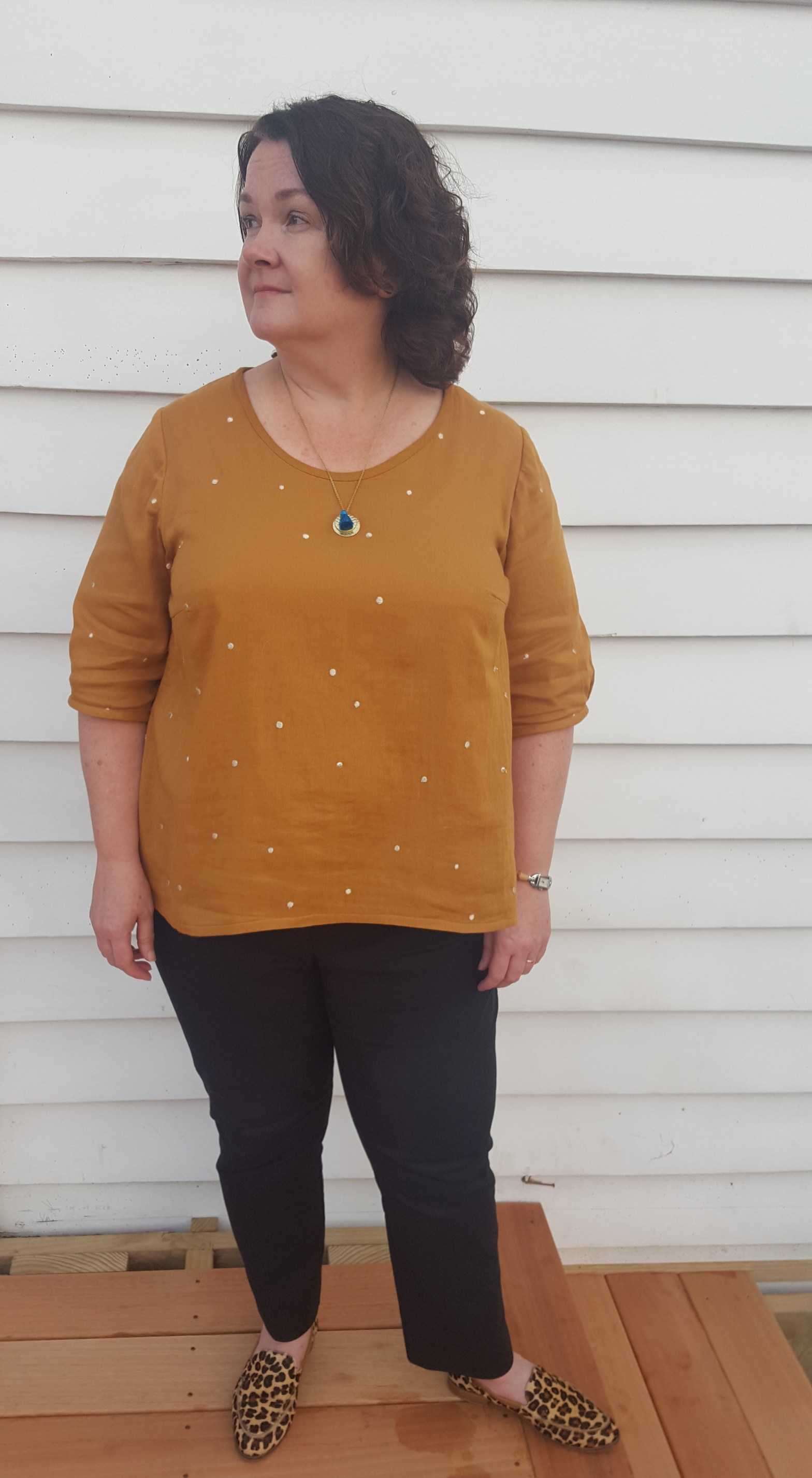 I brought this delicious Atelier Brunette double gauze from Miss Maude a month or two back. Its pricey, but I’m an absolute sucker for anything in this mustard/orange/rust/brown colour palette. If it goes with animal print you can count me in. Add the sparkle of the embroidered circle (dots?) , combined with the softness of a double gauze and I’m sold. But if you’re a lazy toile type (like me) then special fabric is best used with a pattern you trust.
