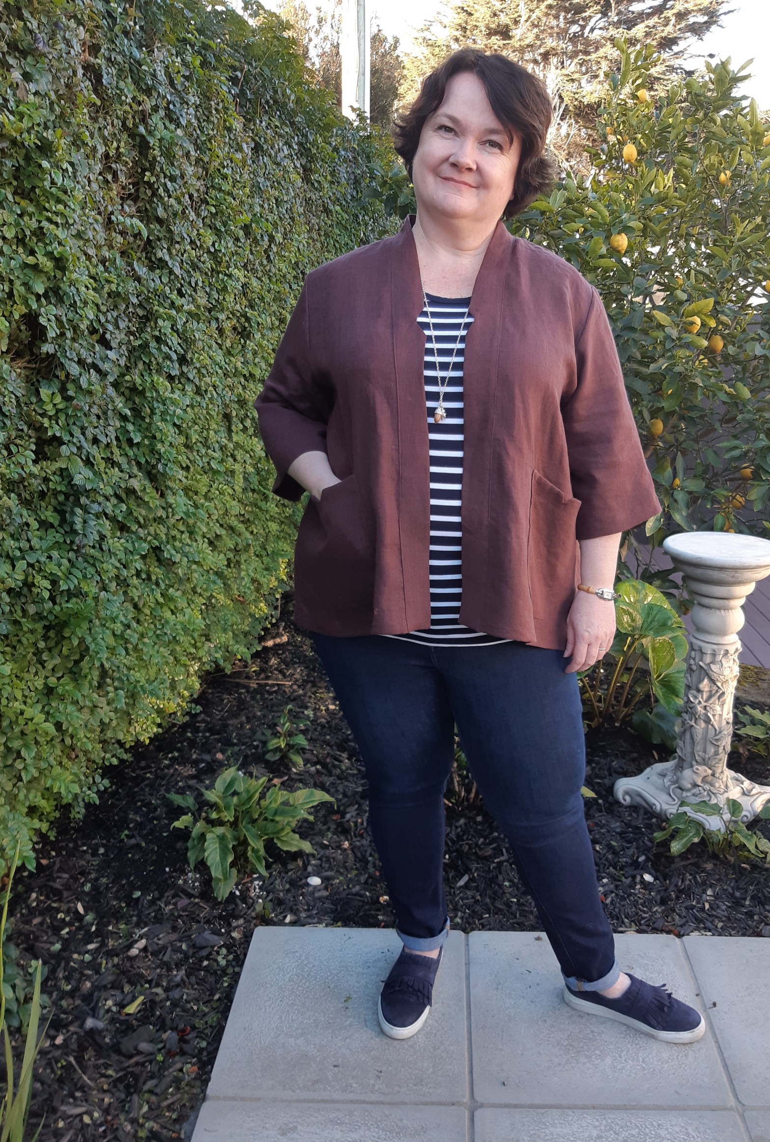 Its a simple unlined jacket with no fastenings, a cute back gather detail & two sleeve variations. Oh and pockets. I knew I had some soft laundered linen in my stash from my fav store Miss Maude that would be perfect, this colour is Oxblood from Merchant & Mills.