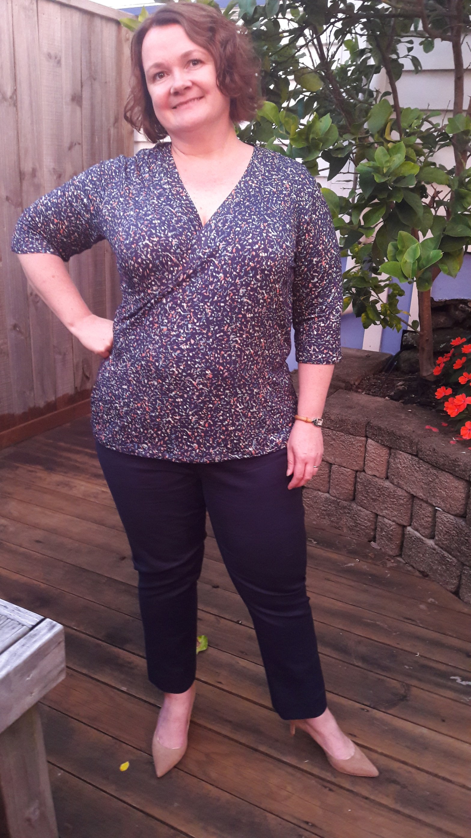 The fabric is a gorgeous merino from The Fabric Store , the back fabric is a lovely swishy Liberty print, the drape is perfect for the style and feels really nice to wear.