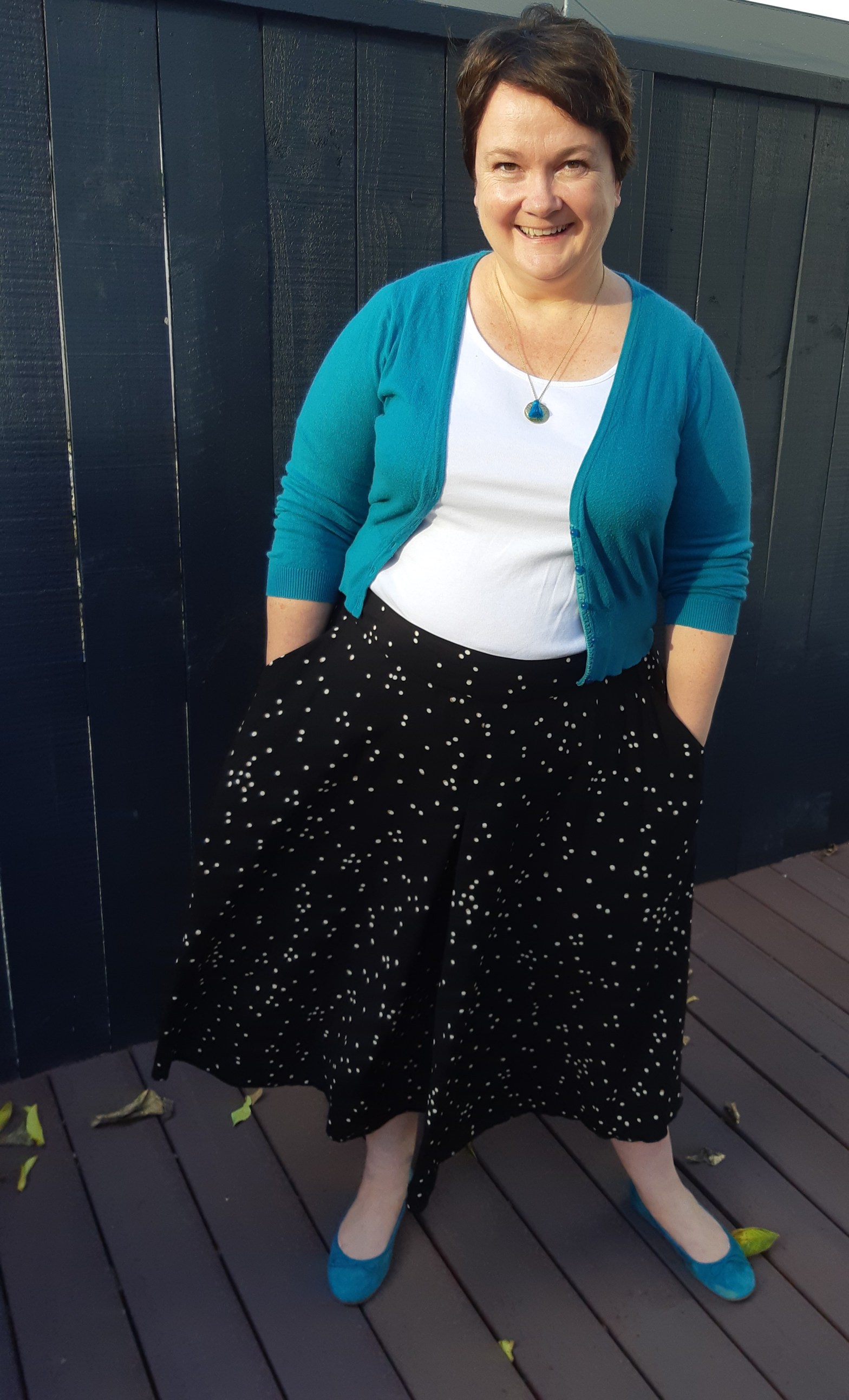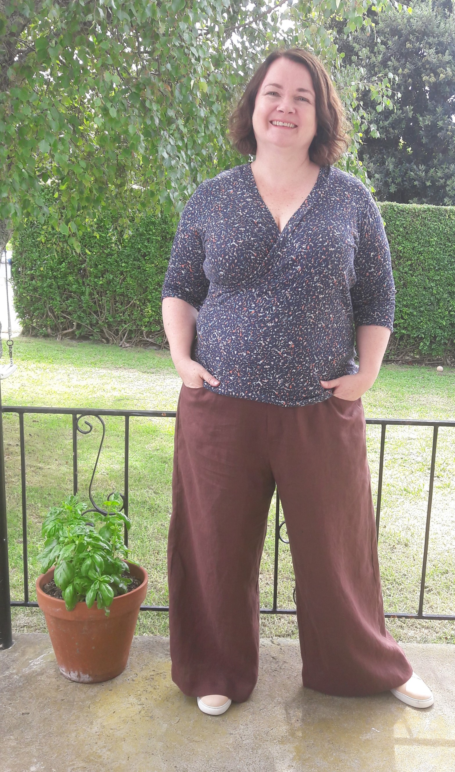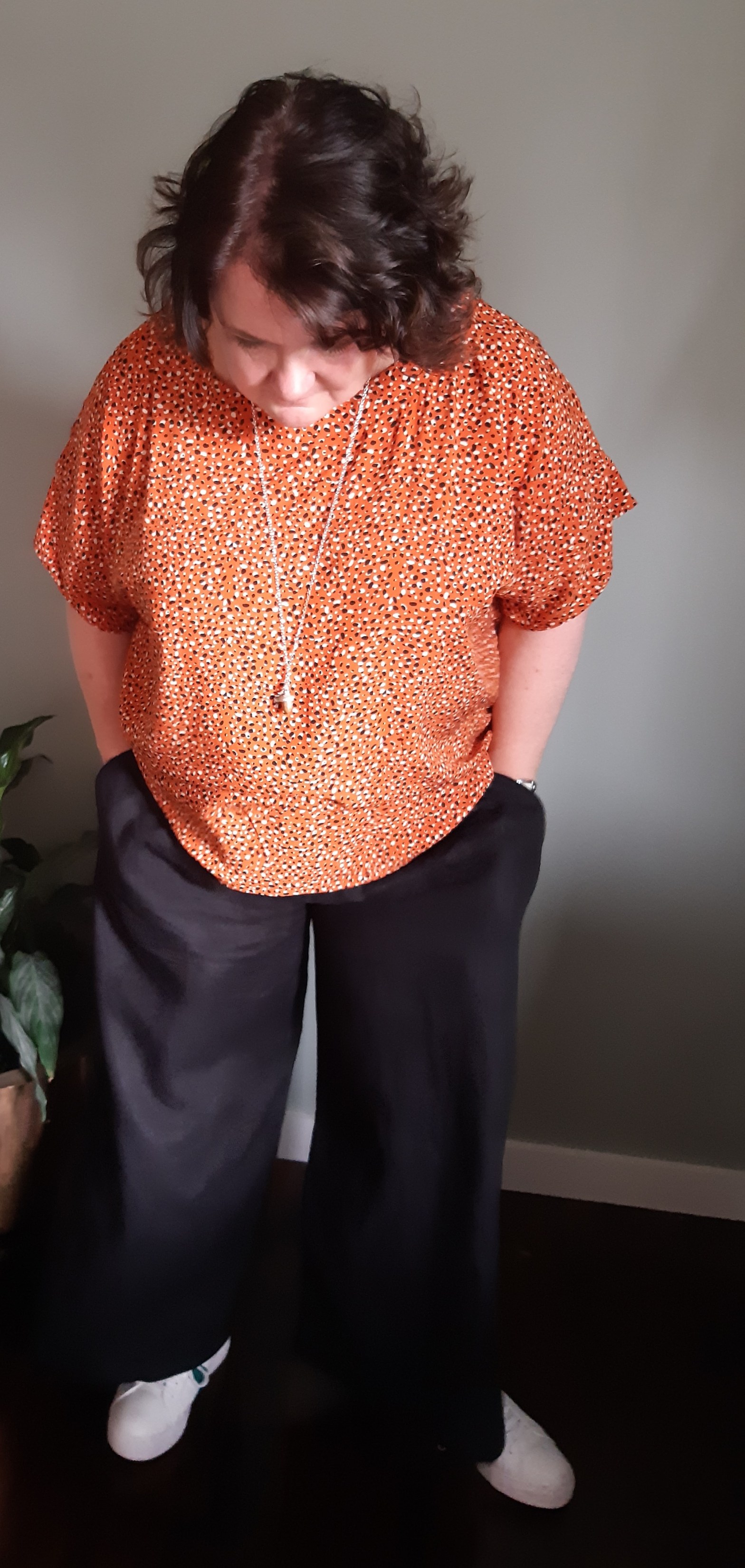 I was gifted some beautiful merino from A & R Fabrics , the colour is Whiskey , appropriate for a Douglas. The softness (& lack of scratch) combined with a good “drape but not cling” are great for this tee. I thought the Whiskey would match perfectly with the mustard dots on my Willandra pants. If I’m standing around in the garden grinning inanely at the fence I want to be colour coordinated ok. Actually this is a perfect weekend outfit, comfy but smart enough for a casual lunch or BBQ (elastic waist for the win too)