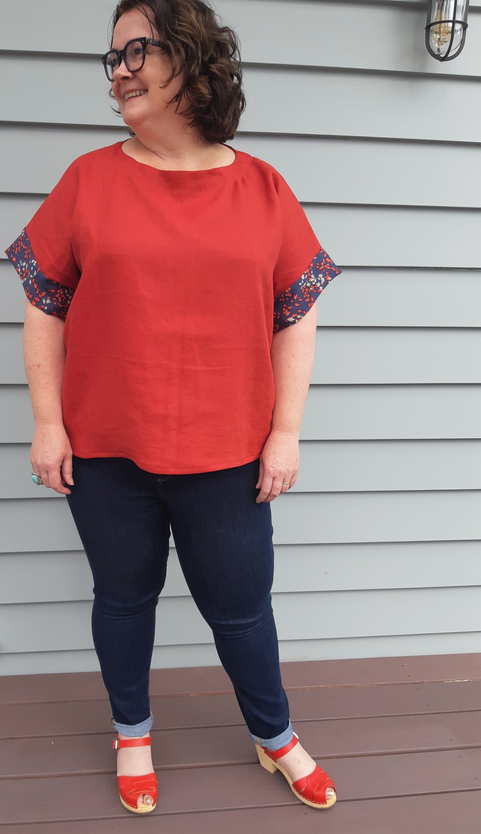 The fabric is gorgeous linen from The Fabric Store, I think the colour is Brick? It’s a lovely rich red with a brown base. The sleeve detail is a mystery vintage fabric I got from my sister’s deep, or in her case, endless, stash. I love the colour and print, but it feels very poly, (I wouldn’t stand anywhere near a naked flame!) Not something I would wear as a full garment, especially in the heat, but perfect for adding an accent. The linen was giving a slightly more structured feel than my previous rayon version, so the floppy sleeve is a nice contrast.