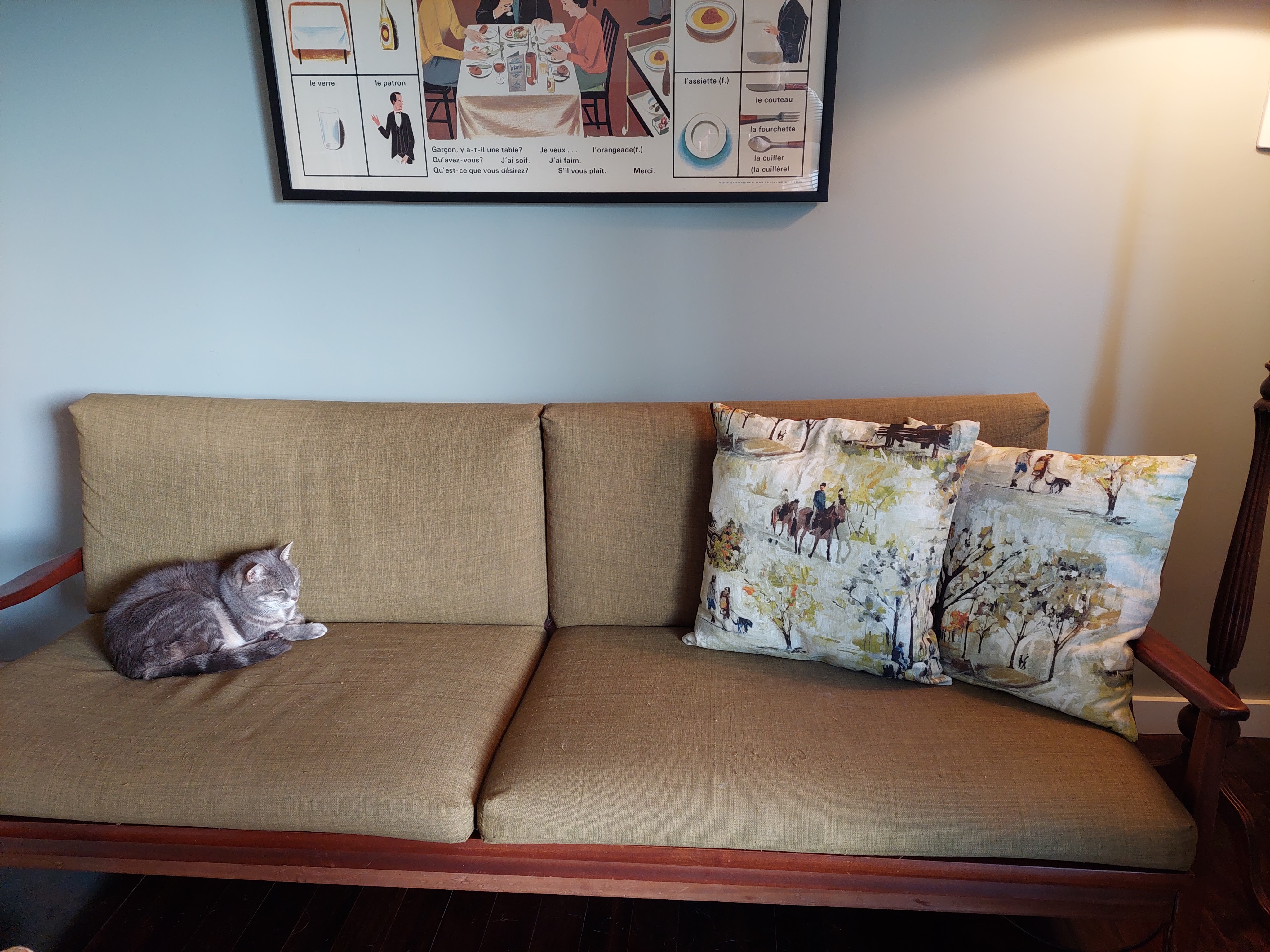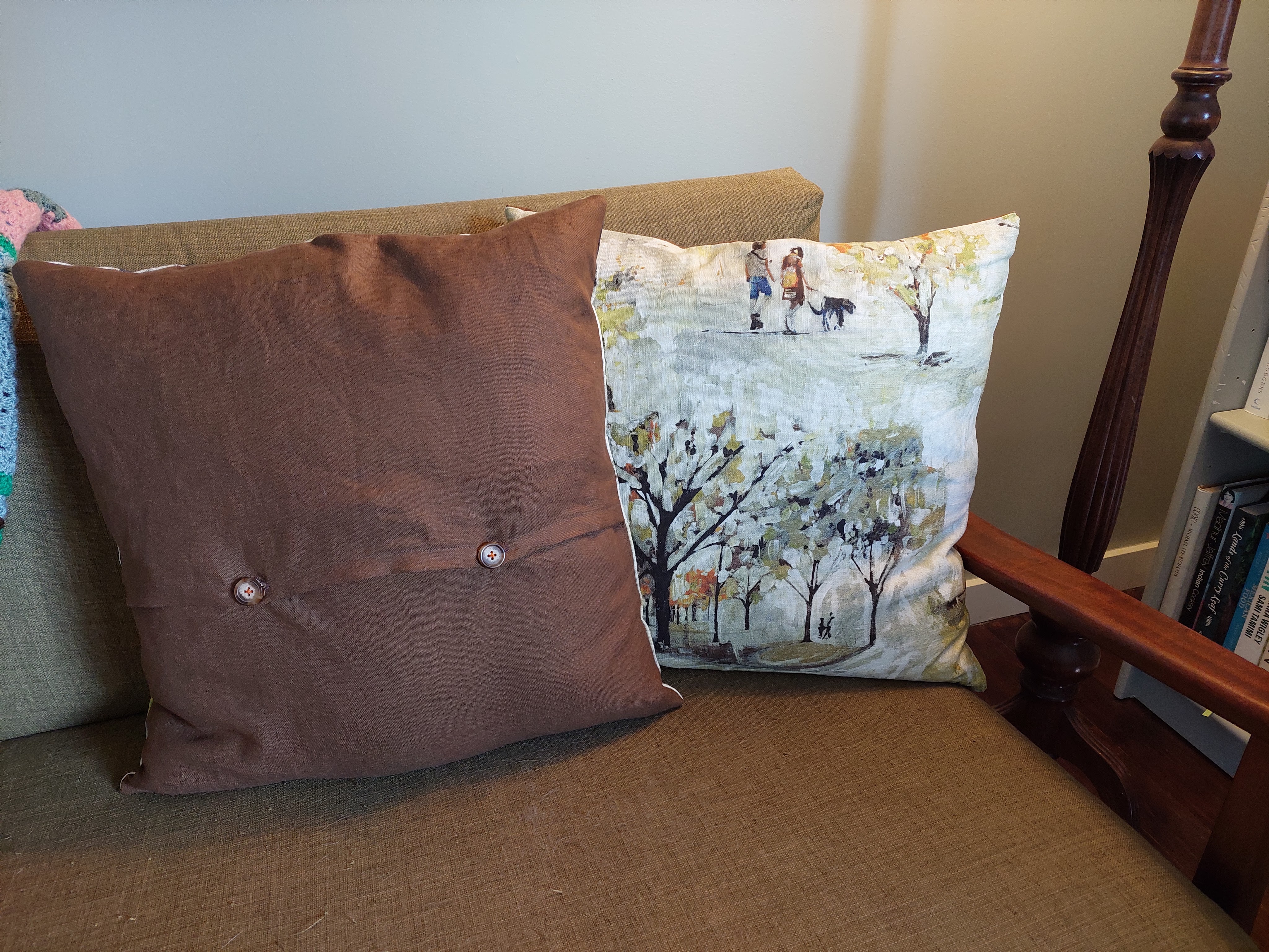I’m quite pleased, the linen backing is offcuts from a dress, the buttons from a worn out blazer of Mr D’s. I do love nice cushions, but I’m also aware anything on our couch is subjected to extreme claw action from three cats, in which case spending $100 plus on a cushion feels rather silly…
