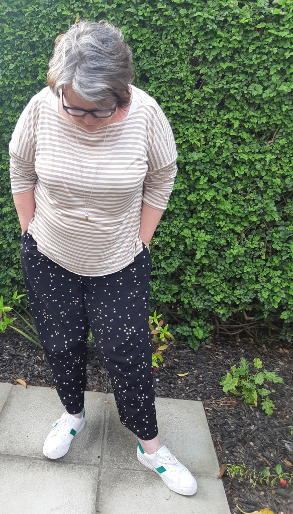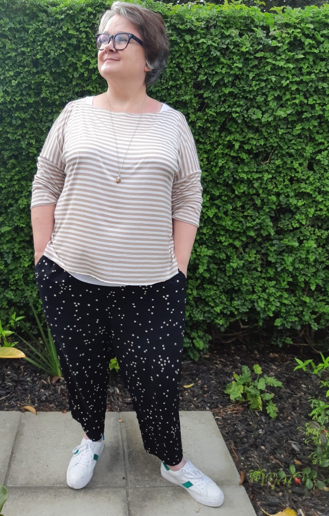 First up is the Tessuti Mandy Boat Tee, which I love (and it’s FREE!) I fiddled a bit with the neckline on this one, its wider than I intended, but a great casual top with my Muna & Broad Willandra pants. I was off to lunch at my sisters so elastic waist pants & a great stretchy top for the win. The fabric is a linen cotton mix from Miss Maude, so delicious to sew and wear.